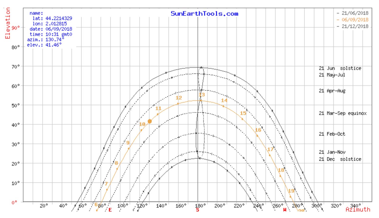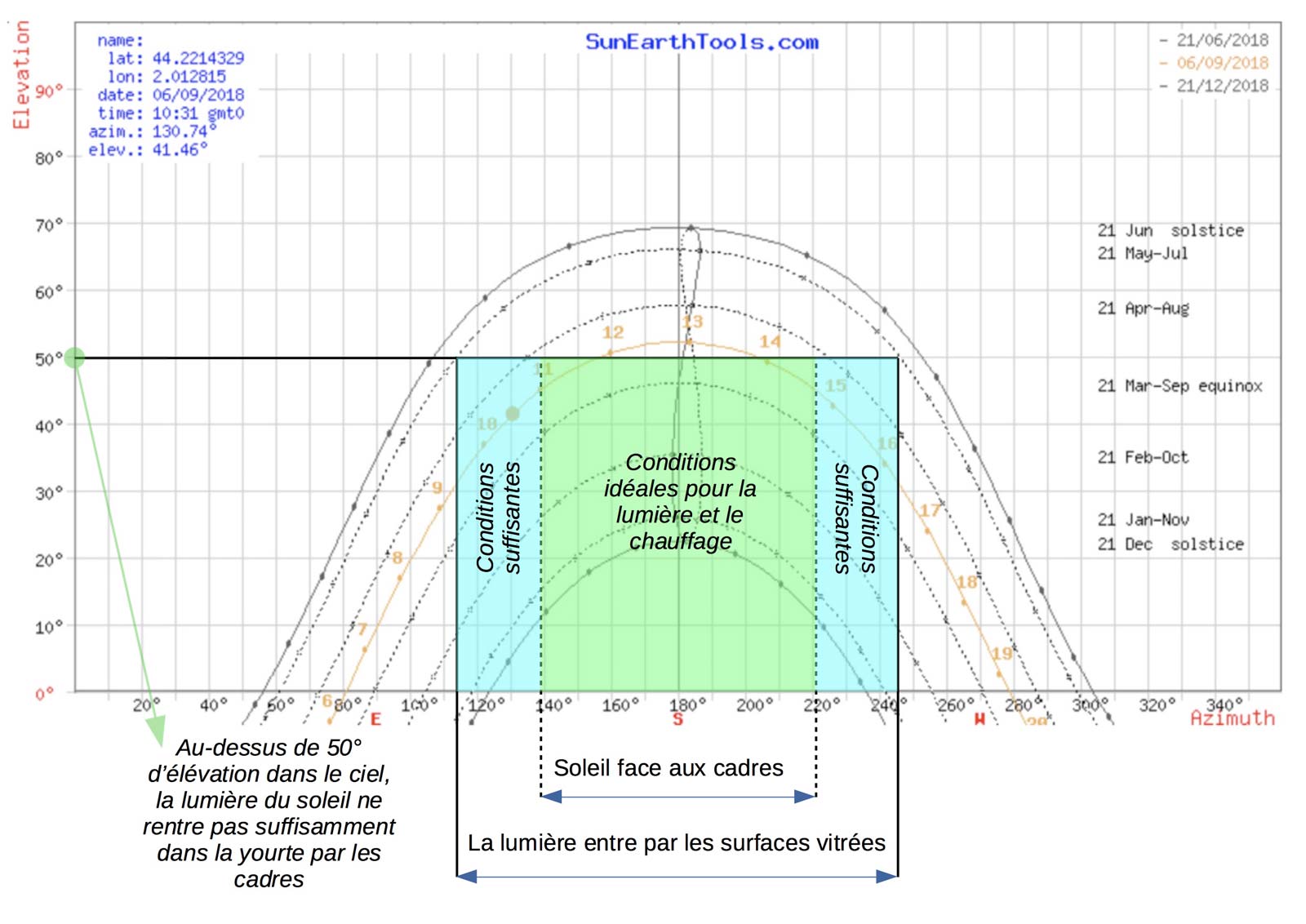 Ce diagramme montre le cheminement du soleil dans le ciel au-dessus de la yourte à certaines dates. Tout en bas par exemple, la course du soleil le 21 décembre, jour le moins ensoleillé de l’année : il se lève à l’azimuth 125° en gros, soit 10° au-dessus du sud-est, pour se coucher à l’azimuth 235° soit 10° au-dessus du sud-ouest. Dans la journée, au plus haut dans le ciel, il n’est qu’à une élévation, c’est à dire un angle au-dessus de l’horizon, d’environ 22°. Ce diagramme nous permet de voir où est le soleil à telle période de l’année et à telle heure.