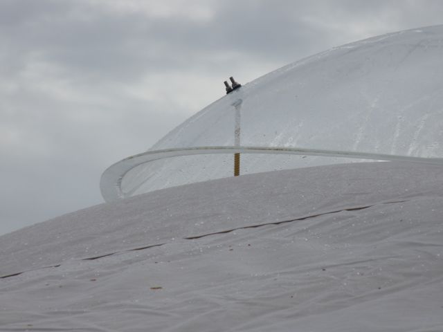 Enfin, le toono, qui culmine à presque 5 mètres au-dessus du plancher, est recouvert par un dôme qui est donc placé au point le plus haut de la yourte et au centre. Ce dôme est entièrement transparent et ouvrant, il se soulève d’une quinzaine de centimètre du côté le moins exposé au vent.
