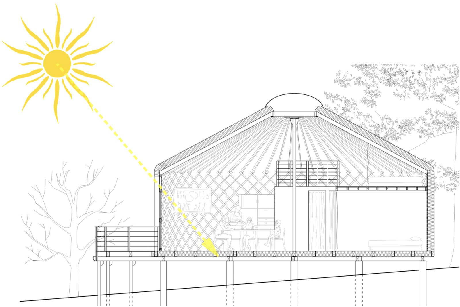 Le schéma ci-après montre une vue en coupe de la yourte avec un soleil a une élévation de 50° au-dessus de l’horizon, le soleil entre alors de 1m50 dans la yourte à midi. Si le soleil est plus haut sur l’horizon, sa lumière rentrera moins dans la yourte, les rayons sont trop verticaux.