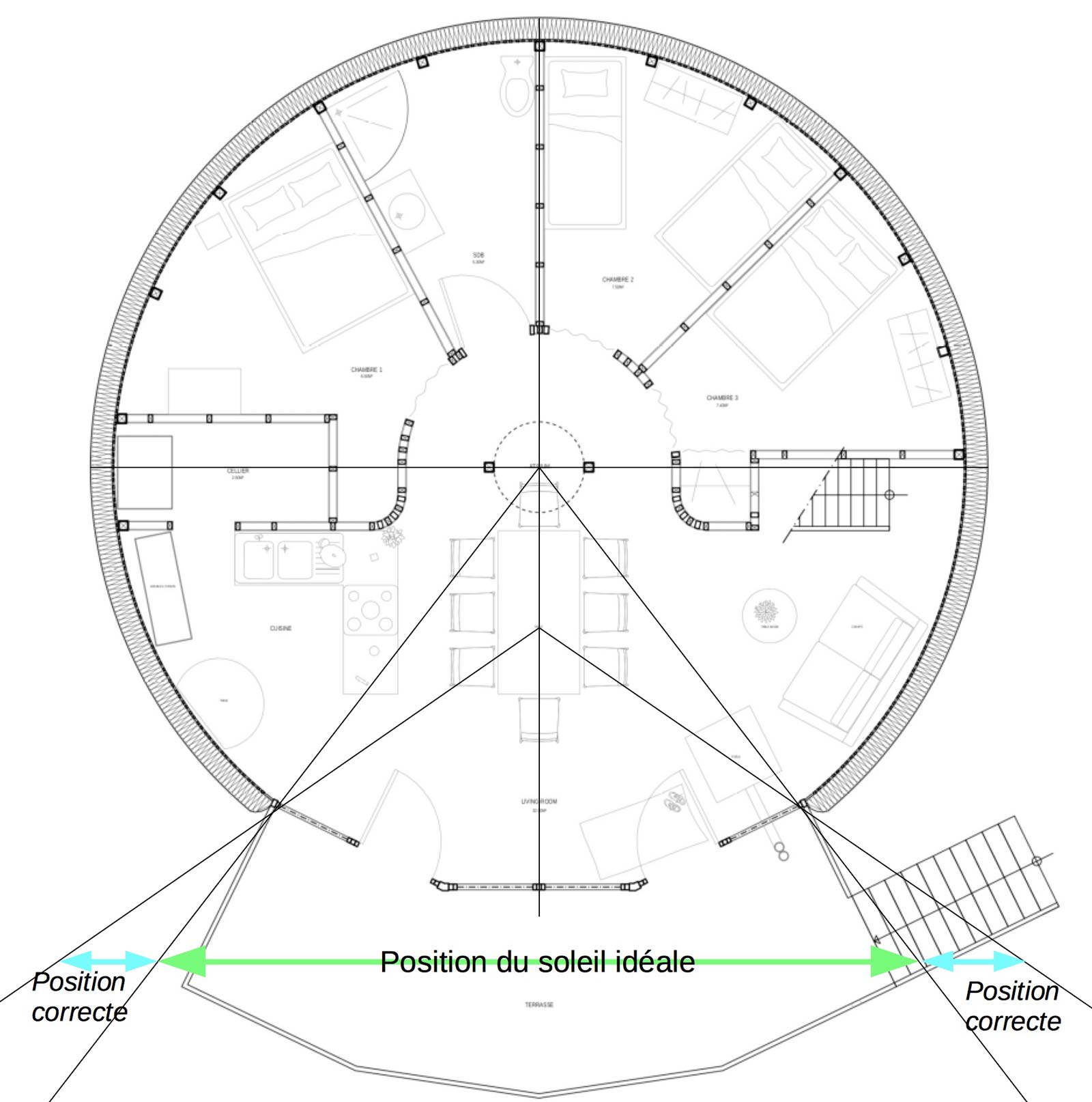 Du 21 novembre au 21 janvier, sur la période la plus froide, c’est toute la course du soleil, du lever au coucher, qui est face aux surfaces vitrées. En février et en octobre, les deux premières et dernières heures de la journée sont en dehors des surfaces vitrées mais il fait alors moins froid et la chaleur du soleil est moins nécessaire. En mars et septembre, le soleil entre significativement (plus de la moitié de l’espace de vie éclairé) par les surfaces vitrées sud entre 9 et 17 heures environ.